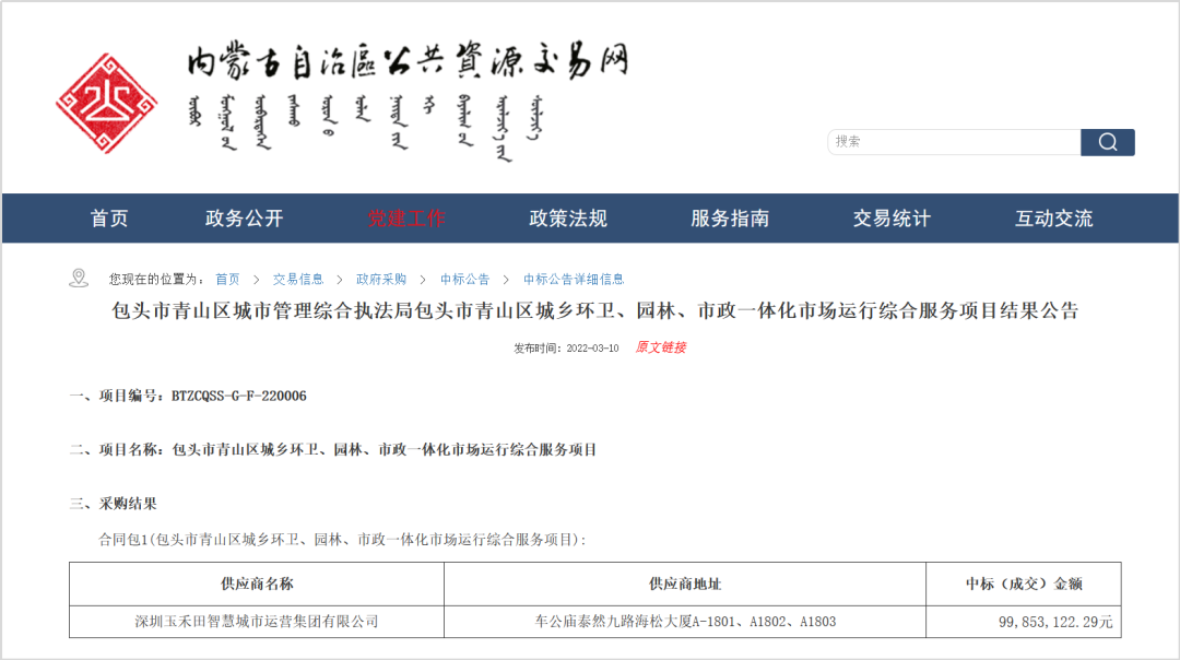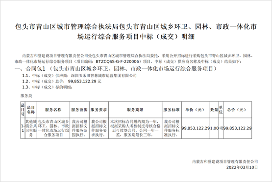 內(nèi)蒙古自治區(qū)政府采購(gòu)網(wǎng)、內(nèi)蒙古自治區(qū)公共資源交易網(wǎng)消息,2022年3月10日,包頭市青山區(qū)城鄉(xiāng)環(huán)衛(wèi)、園林、市政一體化市場(chǎng)運(yùn)行綜合服務(wù)項(xiàng)目開(kāi)標(biāo)。
