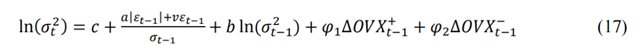 進(jìn)一步檢驗(yàn)OVX的非對(duì)稱(chēng)作用,即區(qū)分OVX上升和下降兩種情況并分別生成變量,同時(shí)納入原EGARCH模型中,比較兩變量的系數(shù)。模型見(jiàn)式(17),結(jié)果如圖6所示,原油市場(chǎng)波動(dòng)增加對(duì)EUA市場(chǎng)波動(dòng)影響更大。