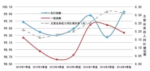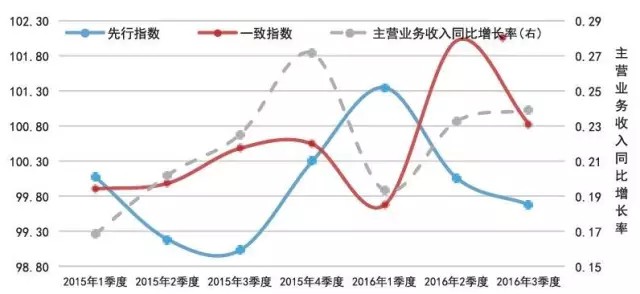 2015 年1季度-2016年3季度A股環(huán)保上市企業(yè)數(shù)據(jù)測(cè)算結(jié)果顯示:一致指數(shù)與A股環(huán)保上市企業(yè)主營(yíng)業(yè)務(wù)收入增長(zhǎng)率的變化趨勢(shì)基本吻合(如圖3所示),先行指 數(shù)的先行特征顯著,驗(yàn)證了EICI指標(biāo)體系的有效性。此外,對(duì)先行指數(shù)進(jìn)行的周期性檢驗(yàn)結(jié)果表明,主營(yíng)環(huán)保上市企業(yè)的先行指數(shù)的領(lǐng)先周期在2015年度為 2個(gè)季度、在2016年度為1個(gè)季度(如圖4所示),該結(jié)果表現(xiàn)出環(huán)保產(chǎn)業(yè)的經(jīng)濟(jì)敏感度有所提高,即先行指數(shù)結(jié)果可用于對(duì)環(huán)保產(chǎn)業(yè)未來1個(gè)季度的走勢(shì)進(jìn)行 預(yù)判。