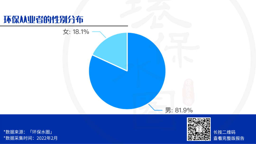 本次調(diào)查發(fā)現(xiàn),環(huán)保從業(yè)群體中男女比例為81.9%:18.1%,接近5:1,與我們在2021年調(diào)查的結(jié)果相比,女性環(huán)保從業(yè)者的比例提升了1.5%~2%,這是一個(gè)非??上驳默F(xiàn)象,希望越來越多的小仙女兒們能加入環(huán)保的隊(duì)伍中來,男女搭配,干活不累!