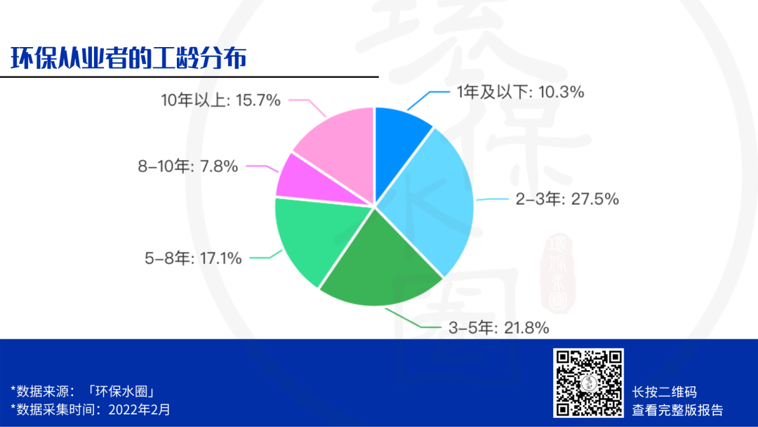 不難看出,工作年限為5-10年的環(huán)保人占了整個(gè)群體的24.9%,屬于資深環(huán)保人。剛參加工作的環(huán)保人占總體的10.3%,工作2-3年的環(huán)保人占總體的27.5%,而工作十年以上的環(huán)保人占總體的15.7%。