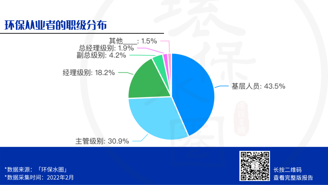我們對環(huán)保從業(yè)者的崗位級別進(jìn)行了調(diào)查,有43.5%的環(huán)保人屬于基層人員,主管級別的小伙伴占30.9%,經(jīng)理級別占18.2%。