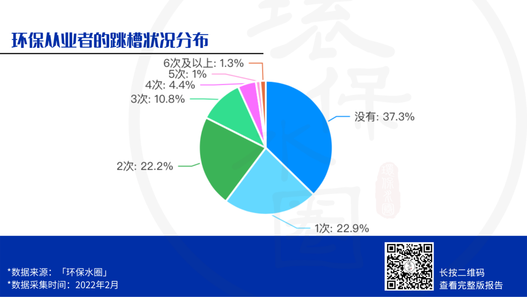 在工作上,工齡8-10年的環(huán)保從業(yè)者占比最少,此類群體往往有經(jīng)驗(yàn)、有能力,但卻選擇半道棄坑,一方面源于行業(yè)內(nèi)部依然普遍存在著能力與收入不相匹配的現(xiàn)象。而對于跳槽,62.7%的環(huán)保人都有過跳槽經(jīng)歷,且跳槽過后的薪資相對提升。