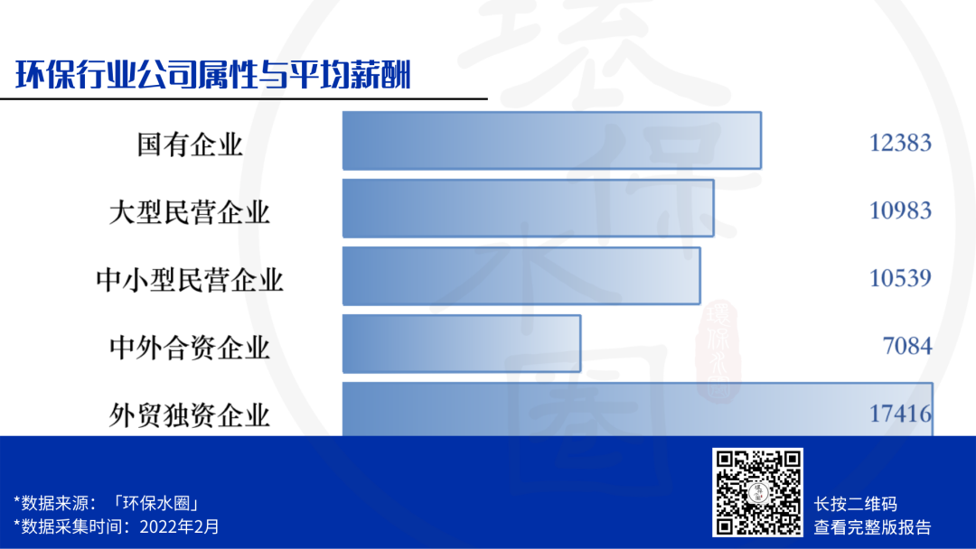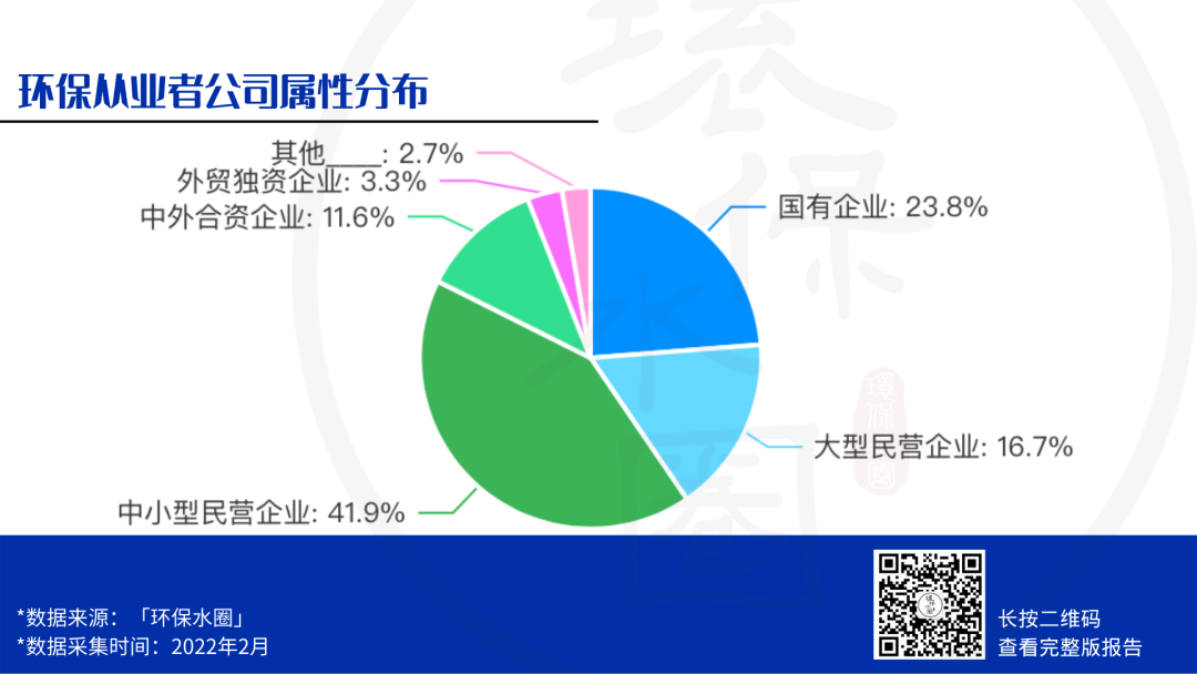 從數(shù)據(jù)中我們還可以看到,有23.8%的環(huán)保人工作在國企,有14.9%的環(huán)保人工作在中外合資或外商獨(dú)資的企業(yè)中,整體占比并不高。