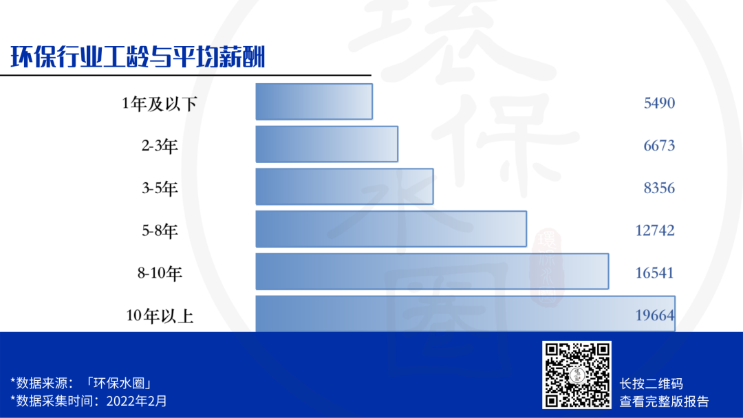 調(diào)研數(shù)據(jù)顯示,環(huán)保人薪資與工齡增長呈正比,越老越吃香是鐵律。 5-8年的環(huán)保人平均薪資超過10000元,10年以上,稅前月薪平均接近20000元。但需要說明的是,工齡到達(dá)8年以后,薪資增幅放緩。
