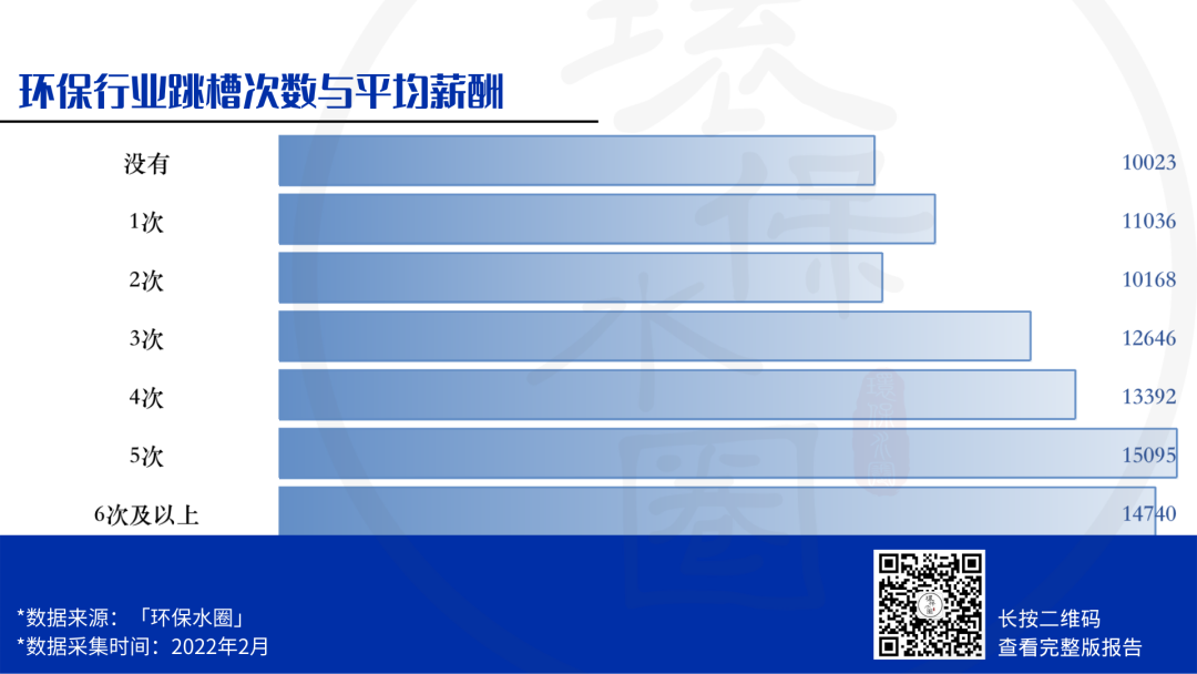 從調(diào)查結(jié)果中可以看到,跳槽經(jīng)歷在3-5次,環(huán)保人的平均薪酬都會有不同幅度的增加。但跳槽頻率不能與次數(shù)劃等號,往往工作三年是一個(gè)分水嶺,高頻率的跳槽不僅對薪資增幅毫不幫助,還會影響個(gè)人能力的提升和經(jīng)驗(yàn)的積累。