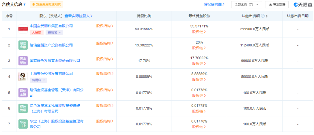 3月,寶武綠碳私募投資基金(上海)合伙企業(yè)(有限合伙)成立,執(zhí)行事務(wù)合伙人為建信金投基金管理(天津)有限公司、華寶(上海)股權(quán)投資基金管理有限公司,經(jīng)營范圍為以私募基金從事股權(quán)投資、投資管理、資產(chǎn)管理等活動。