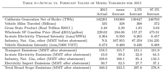 其次,作者以加州溫室氣體配額交易市場(chǎng)1990-2010年的數(shù)據(jù)樣本,構(gòu)建了VAR模型并采用協(xié)整分析方法估計(jì)了BAG下2013-2020年加州碳市場(chǎng)涵蓋行業(yè)的溫室氣體排放總量。作者對(duì)潛在市場(chǎng)均衡分布的分析分三個(gè)階段進(jìn)行。第一,使用時(shí)間序列方法估計(jì)了BAU下的配額交易市場(chǎng)排放驅(qū)動(dòng)因素的計(jì)量經(jīng)濟(jì)學(xué)模型,并根據(jù)配額交易市場(chǎng)排放驅(qū)動(dòng)因素的現(xiàn)有趨勢(shì),使用該模型估計(jì)未來配額交易市場(chǎng)排放的概率密度。第二,考慮了來自指揮和控制法規(guī)的溫室氣體減排,以及總量管制和交易計(jì)劃之外的其他“非市場(chǎng)”因素。第三,使用一系列能源價(jià)格彈性估計(jì)值來解釋溫室氣體排放價(jià)格可能帶來的減排。