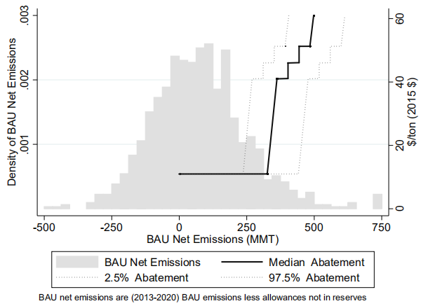 如圖2所示,通過分析減排需求和減排供給的估計(jì)值,文章發(fā)現(xiàn)市場(chǎng)出清時(shí),溫室氣體交易的價(jià)格有94.8%的概率處于或者接近價(jià)格下限即拍賣底價(jià)(Auction Reserve Price,ARP)。這意味著相對(duì)于估計(jì)得到的BAU排放量,排放配額的設(shè)定過高,此時(shí)經(jīng)濟(jì)主體通過非市場(chǎng)因素的配套政策即可完成溫室氣體減排約束,無需在交易市場(chǎng)上高價(jià)購(gòu)買排放配額。價(jià)格處于“內(nèi)部均衡”,即均衡價(jià)格高于價(jià)格下限ARP但低于價(jià)格上限(Allowance Price Containment Reserve,APCR)的概率為1.2%,此時(shí)溫室氣體排放的價(jià)格彈性較高,配額交易市場(chǎng)的減排有效性達(dá)到最優(yōu)狀態(tài)。