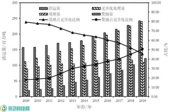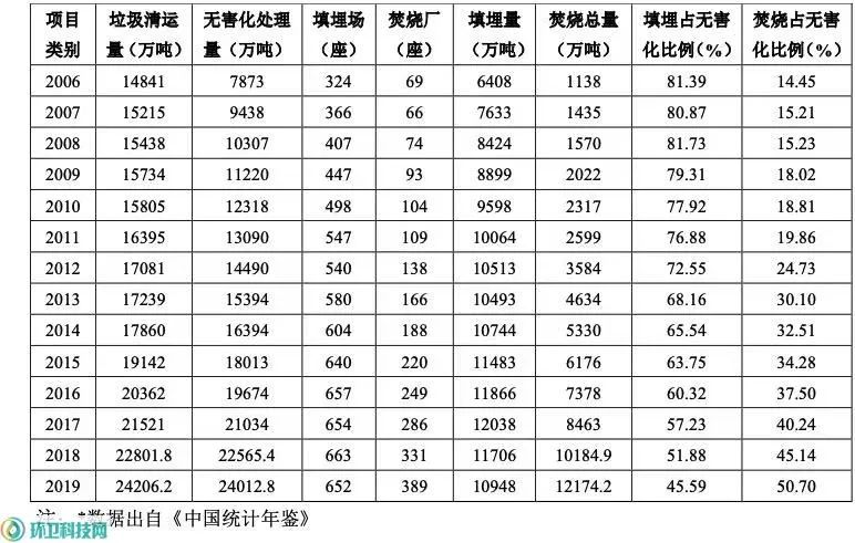 圖1 2009年至2019年城市生活垃圾不同無害化處置技術(shù)處置量及所占比例表1我國城市生活垃圾填埋發(fā)展趨勢與狀況(2006年~2019年)* 1.2填埋比例