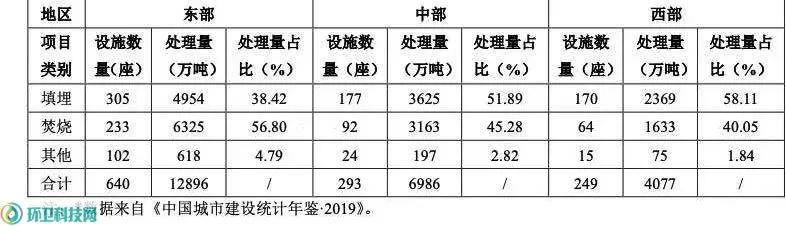 表2 2019年我國東、中、西部地區(qū)城市生活垃圾不同無害化處置技術(shù)對比* 2縣城生活垃圾填埋場
