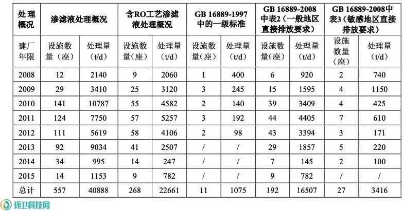據(jù)調(diào)研,2008年7月1日后建設(shè)的滲濾液處理設(shè)施共557座,總處理量為40888t/d(見表4)。其中,執(zhí)行GB16889-2008標(biāo)準(zhǔn)的設(shè)施共281座,處理量為24148t/d,含RO工藝滲濾液處理設(shè)施共268座,處理量為22661t/d;而執(zhí)行GB16889-1997中一級(jí)排放標(biāo)準(zhǔn)的僅有11座,處理量為1075t/d。由此可知,反滲透工藝在新標(biāo)準(zhǔn)執(zhí)行過程中占主導(dǎo)地位,約占新建處理設(shè)施的48.1%。以執(zhí)行GB16889-2008和GB16889-1997中一級(jí)標(biāo)準(zhǔn)的滲濾液處理設(shè)施為達(dá)標(biāo)處理設(shè)施,其滲濾液處理總量為20998t/d,達(dá)標(biāo)率為51.4%。但根據(jù)實(shí)際調(diào)研情況,達(dá)標(biāo)滲濾液處理工藝的實(shí)際占比小于51.4%。