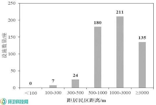 GB16889-2008規(guī)定:生活垃圾填埋場場址的位置及與周圍人群的距離應(yīng)依據(jù)環(huán)境影響評(píng)價(jià)結(jié)論確定,并經(jīng)地方環(huán)境保護(hù)行政主管部門批準(zhǔn)。由圖3可知,2010~2015年新建填埋場中,填埋場場址距周邊居民區(qū)小于300米的有7座,300~500米的有24座,二者占有效數(shù)據(jù)(557座)的5.6%;500~1000米的有180座,占有效數(shù)據(jù)的32.5%;而距離大于3000米以上的填埋場僅135座,占有效數(shù)據(jù)的24.2%?,F(xiàn)場調(diào)研情況和統(tǒng)計(jì)分析結(jié)果表明:距居民區(qū)1000米內(nèi)填埋場的惡臭投訴事件近90%,而距居民區(qū)大于3000米填埋場的惡臭投訴事件則幾乎沒有。