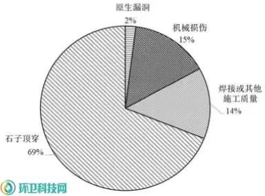 防滲層破損原因大致分為原生漏洞和次生漏洞兩種類型,其中次生漏洞又包括石子或樹根頂穿、機(jī)械損傷以及焊接問題三種類型。通過對漏洞檢測數(shù)據(jù)的統(tǒng)計(jì)分析,得出上述不同原因造成的HDPE膜破損的比例如圖4所示。