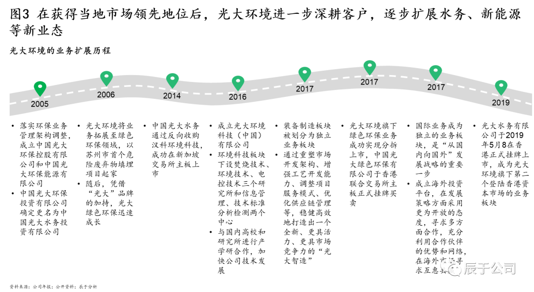 光大環(huán)境在獲得當?shù)乩贌袌龅念I先地位后,進一步深耕客戶,逐步擴展水務、新能源等業(yè)態(tài)(見圖3),最終目標是打造成為一站式環(huán)境綜合治理服務商,形成環(huán)保能源、綠色環(huán)保、環(huán)保水務、生態(tài)資源、環(huán)境規(guī)劃、綠色科創(chuàng)、光大照明、裝備制造八大業(yè)務板塊,深挖協(xié)同效應。
