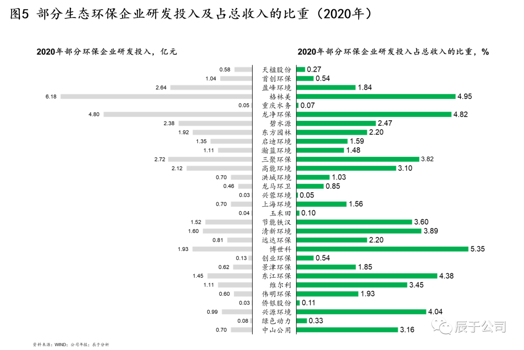 不得不說,大部分生態(tài)環(huán)保企業(yè)并不重視技術創(chuàng)新投入。對國內(nèi)環(huán)保上市企業(yè)的統(tǒng)計發(fā)現(xiàn),很多企業(yè)每年的研發(fā)投入不足2億元,占收入的比重不足3%(見圖5)。即使全球巨頭蘇伊士環(huán)境,每年研發(fā)投入近1億歐元,占其收入的比重不足1%。