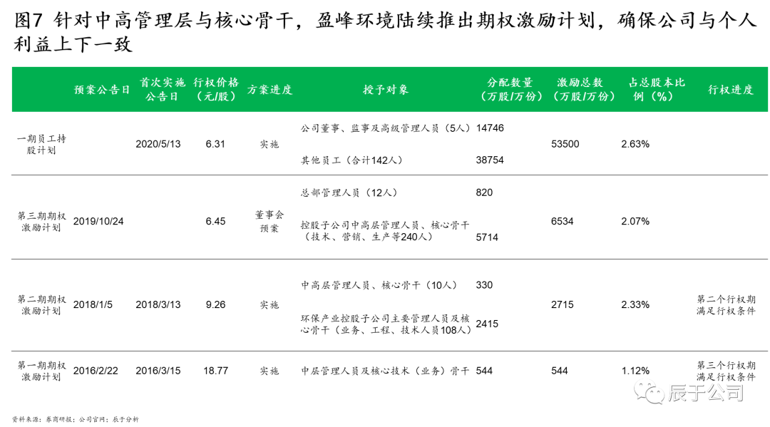 盈峰環(huán)境的掌舵人何劍鋒曾在多個場合下強調(diào)其發(fā)展的三個核心:訂單導向、技術創(chuàng)新、人才激勵。自2016年開始,盈峰環(huán)境多次推出人才激勵計劃,把握獎勵過去、激勵未來的核心觀念,不斷提高激勵總額度、擴大激勵對象與范圍、優(yōu)化業(yè)績考核要求,既完善了員工薪酬結構,提升了員工積極性與穩(wěn)定性,也實現(xiàn)了治理結構的優(yōu)化,保障管理層與公司利益的長期一致性(見圖7)。