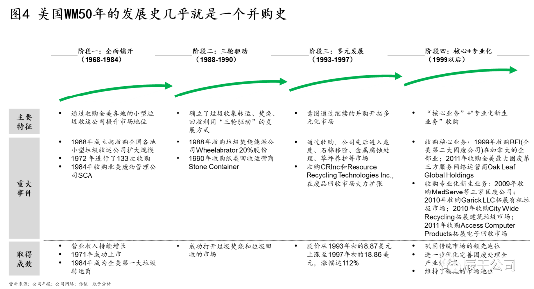 美國WM的50年發(fā)展幾乎就是一個并購史,可分為四個階段(見圖4):1968~1984年全面鋪開階段,通過收購全美各地的小型垃圾收運公司提升市場地位,其中1972 年就進行了133 次收購,1984年收購北美廢物管理公司SCA之后,成為全美第一大垃圾運轉商;1988~1990年三輪驅動階段,確立了垃圾收集轉運、焚燒、回收利用“三輪驅動”的發(fā)展方式,通過并購垃圾焚燒能源公司W(wǎng)heelabrator和紙類回收運營商Stone Container等手段實現(xiàn);1993~1997年多元發(fā)展階段,WM意圖通過大舉并購開拓多元化市場,通過收購先后進入危廢、石棉移除、金屬腐蝕處理、草坪養(yǎng)護等市場,股價從1993年初的8.87美元上漲至1997年初的18.86 美元,漲幅達112%(不過事后證明這個階段的過度多元化并購是失敗的);1999年以后WM開始專注在核心業(yè)務+專業(yè)化新生業(yè)務的并購,其中核心業(yè)務收購了BFI(全美第二大固廢公司)在加拿大的全部業(yè)務和全美最大固廢第三方服務網(wǎng)絡運營商Oak Leaf Global Holdings,這些并購不僅鞏固了WM傳統(tǒng)市場的領先地 U7Y位,也完善了固廢處理全產(chǎn)業(yè)鏈布局。
