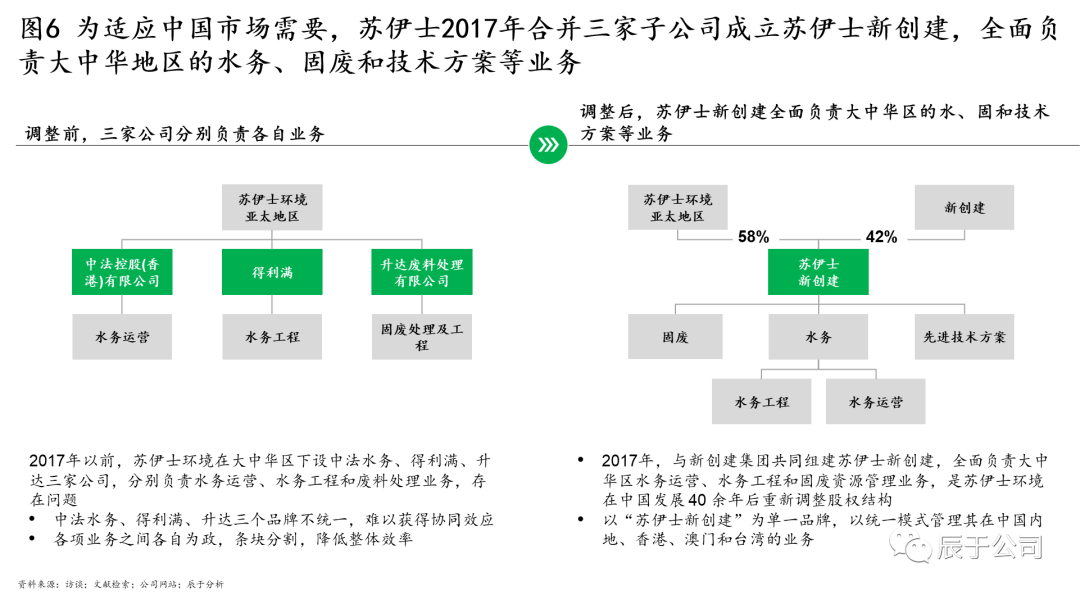 蘇伊士中國也在2017年對其組織架構進行了優(yōu)化。2017年以前,蘇伊士在大中華區(qū)下設中法水務、得利滿、升達三家公司,分別負責水務運營、水務工程和固廢廢物處理業(yè)務,由于三個品牌不統(tǒng)一、難以獲得協(xié)同效應,各業(yè)務之間各自為政、條塊分割,降低了整體效率。對此,2017年蘇伊士與新創(chuàng)建集團共同組建蘇伊士新創(chuàng)建,全面負責公司在大中華地區(qū)的水務運營、水務工程和固廢資源管理業(yè)務,這是蘇伊士在中國發(fā)展 40 余年后重新調(diào)整股權結構,同時以“蘇伊士新創(chuàng)建”為單一品牌,以統(tǒng)一模式管理其在中國內(nèi)地、香港、澳門和臺灣的業(yè)務(見圖6)。2021年初對蘇伊士新創(chuàng)建和蘇渝兩家公司的股權收購則進一步強化了組織合力。