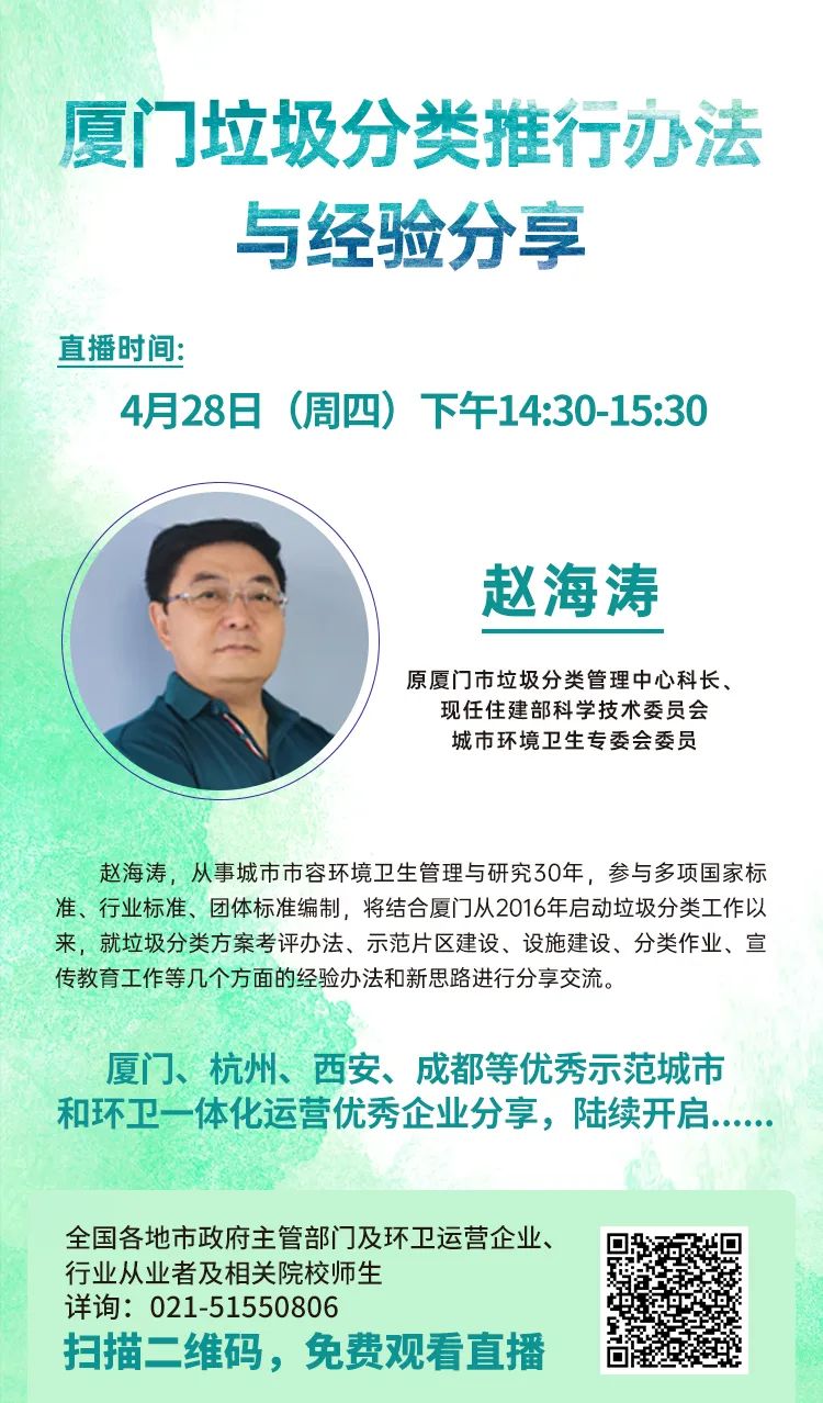 ■就 “廈門垃圾分類推行辦法與經(jīng)驗(yàn)分享”為主題做線上直播,直播時(shí)間為4月28日(周四)下午14:30-15:30,歡迎大家踴躍報(bào)名,掃碼免費(fèi)觀看直播。