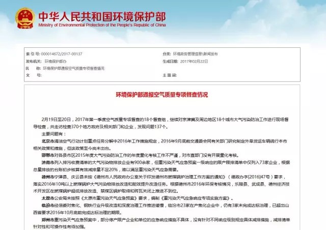 2月19日至20日,2017年第一季度空氣質(zhì)量專項(xiàng)督查的18個(gè)督查組,繼續(xù)對京津冀及周邊地區(qū)18個(gè)城市大氣污染防治工作進(jìn)行現(xiàn)場督導(dǎo)檢查,共走訪檢查370個(gè)地方政府及相關(guān)部門和企業(yè),發(fā)現(xiàn)問題137個(gè)。