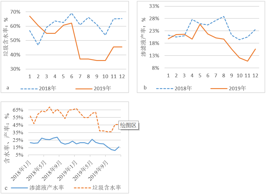 圖9 2018年-2019年生活垃圾分類前后垃圾含水率、滲濾液產(chǎn)率及兩者變化趨勢(shì)