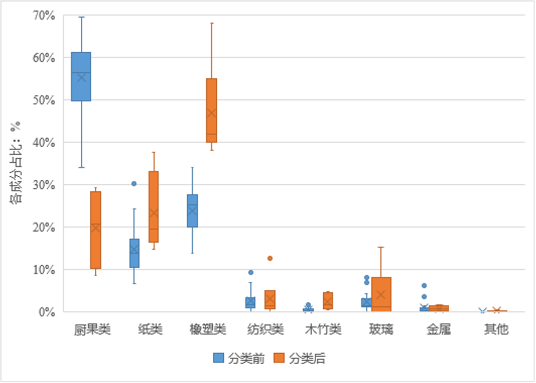 圖1 生活垃圾分類前、后各成分占比分布對(duì)比圖