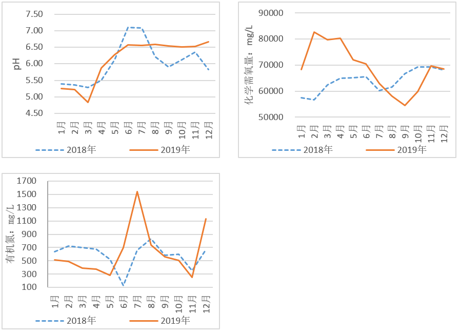 圖12 2018年與2019年生活垃圾分類前后滲濾液水質(zhì)中pH、化學(xué)需氧量、總氮變化趨勢(shì)