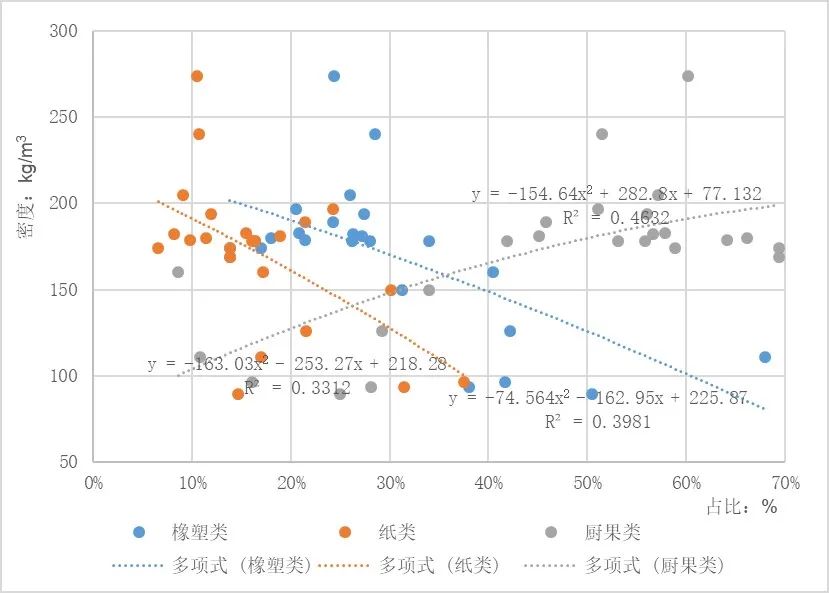 圖13 生活垃圾主要成分占比對(duì)垃圾密度的影響趨勢(shì)圖