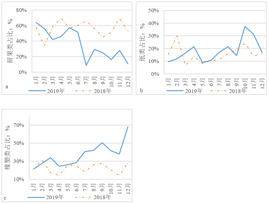 圖7 2018年與2019年生活垃圾分類前后主要成分占比趨勢(shì)