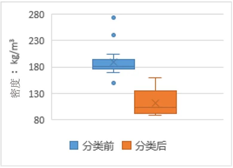 生活垃圾分類前后密度分布對(duì)比見圖2。分類前,進(jìn)入焚燒廠的生活垃圾密度在150-274 kg/m3之間變化,均值為187 kg/m3。分類后,進(jìn)入焚燒廠的生活垃圾密度在89.6-160 kg/m3之間變化,均值為112.75 kg/m3。
