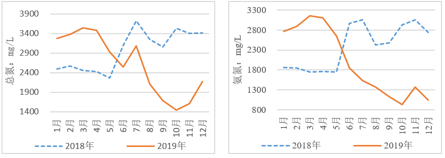 圖11 2018、2019年生活垃圾分類前后滲瀝液水質(zhì)中氨氮、有機(jī)氮變化趨勢(shì)