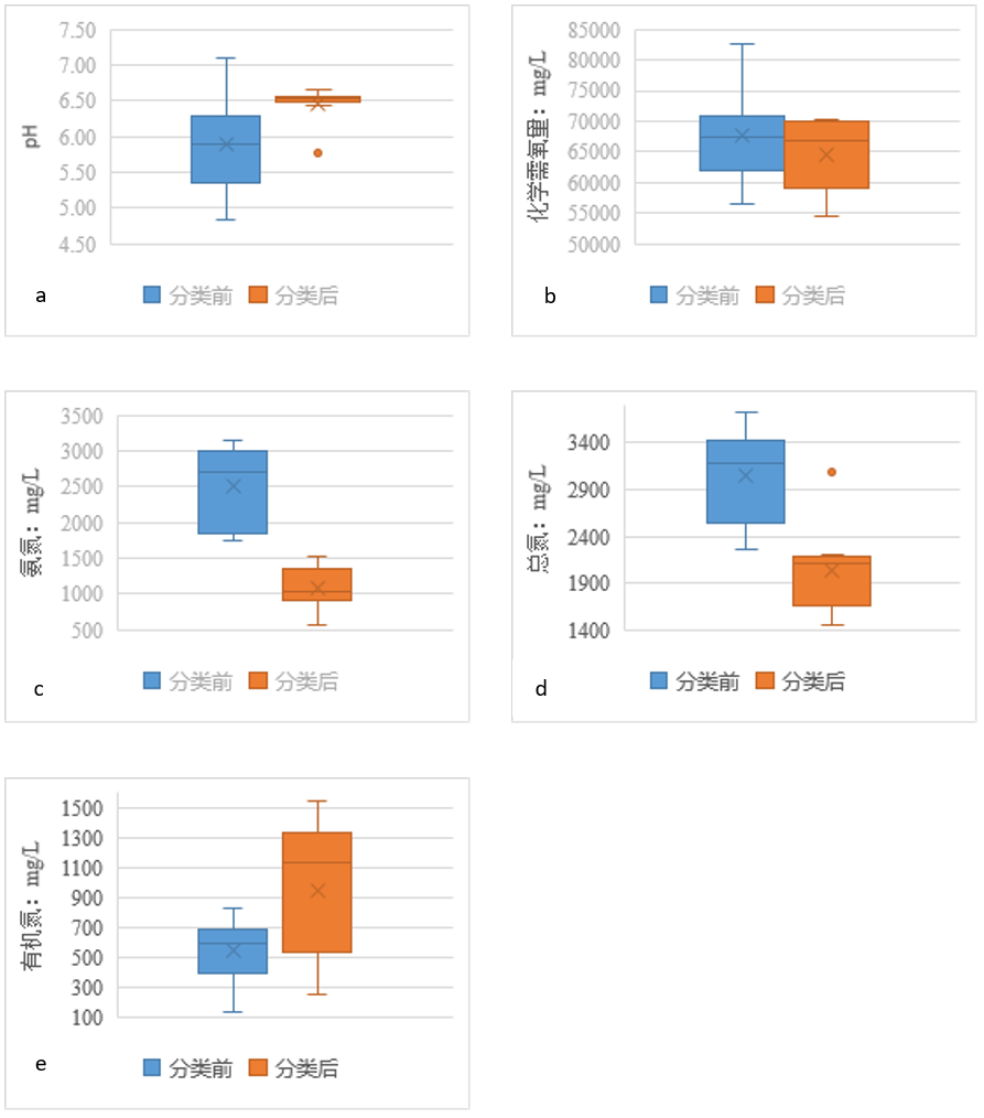 圖5 生活垃圾分類前后滲濾液主要水質(zhì)指標(biāo)分布對(duì)比