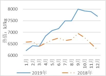 分類后進(jìn)入焚燒廠的生活垃圾,廚果類占比降低、紙類與橡塑類占比升高、滲濾液產(chǎn)率降低,單位質(zhì)量中可燃物占比增大,垃圾熱值提升[5],同比上升17%,變化趨勢(shì)見圖10。