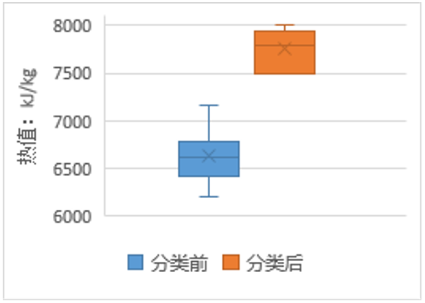 生活垃圾分類前后熱值分布對(duì)比見圖4。分類前,進(jìn)入焚燒廠垃圾熱值為6208-7165 kJ/kg,均值為6634 kJ/kg。分類后,進(jìn)入焚燒廠垃圾熱值為7490-7997 kJ/kg,均值為7749 kJ/kg。