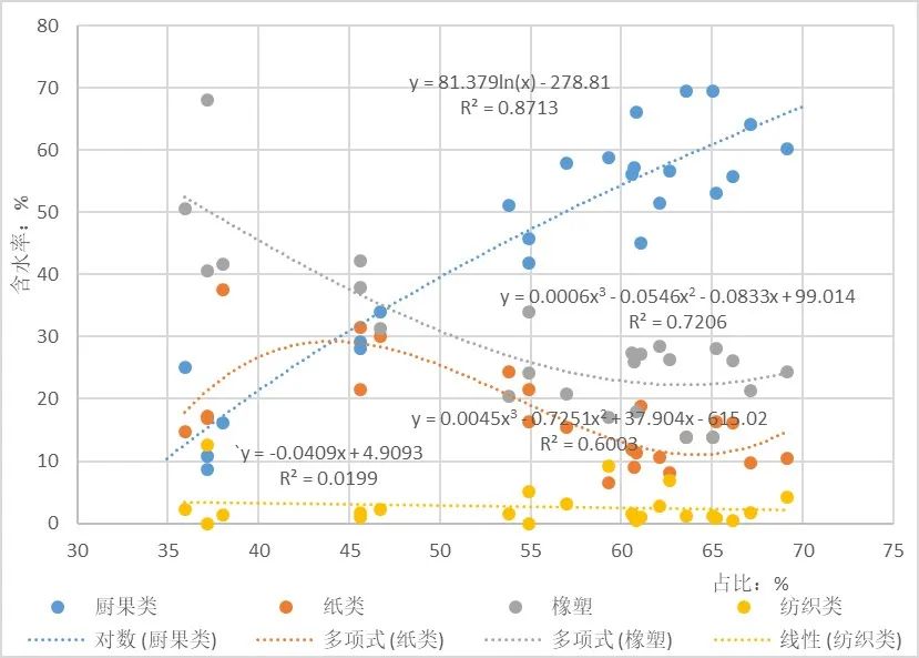 垃圾組分中,廚果類、紙類、橡塑類及紡織類垃圾對(duì)含水率影響較大[6]。選取2018年1月-2019年12月生活垃圾各組分占比變化與含水率數(shù)據(jù)耦合分析,廚果類占比與含水率呈正相關(guān)關(guān)系;橡塑類、紡織類占比與含水率呈負(fù)相關(guān)關(guān)系;而紙類占比與垃圾水率關(guān)系呈波動(dòng)關(guān)系,即為在占比低于45%及高于65%時(shí)與含水率成正相關(guān)關(guān)系,占比在45%-65%與含水率成負(fù)相關(guān)關(guān)系,垃圾主要成分對(duì)垃圾含水率影響趨勢(shì)見圖14。