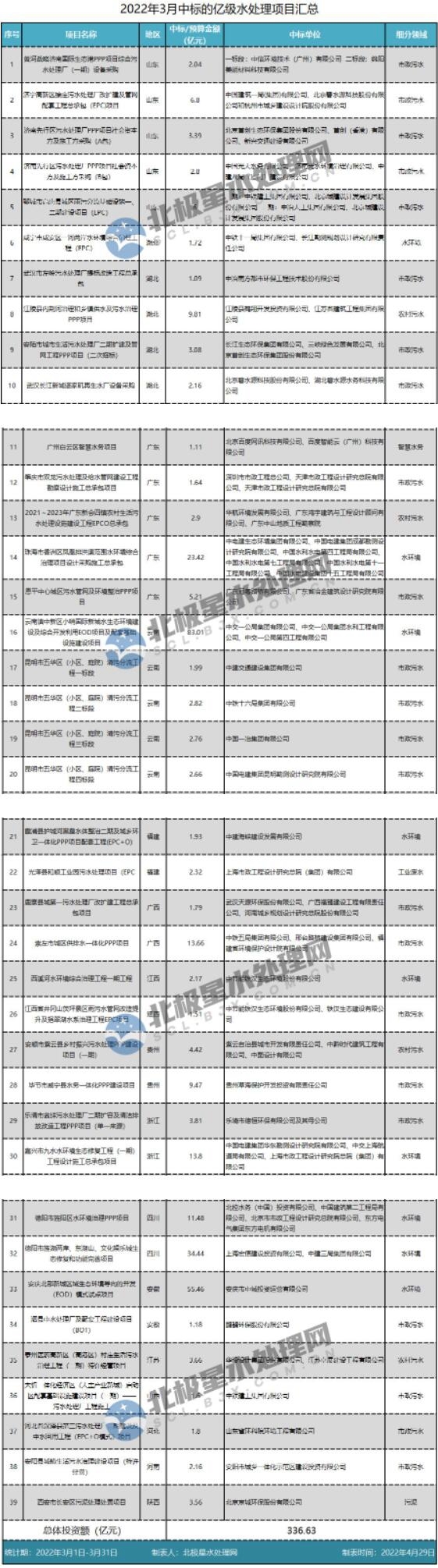 據(jù)統(tǒng)計,2022年3月開標(biāo)億級水處理項目39個(含部分預(yù)中標(biāo),不含上個月已統(tǒng)計的預(yù)中標(biāo),不含供水),涉及16大省份,總投資額336.63億元。