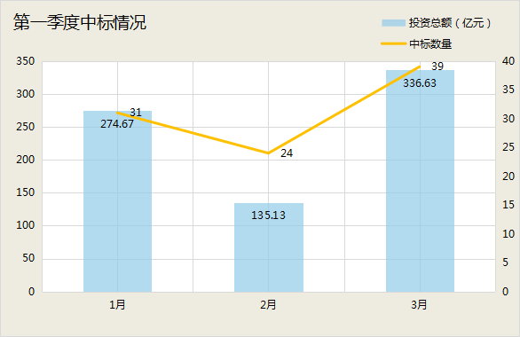 第一季度,開標(biāo)的億級水處理項目共94個,涉及總投資746億元,其中3月份的勢頭最盛。
