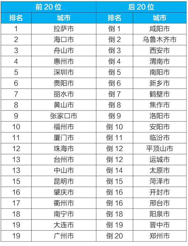 1—4月,168個重點城市中,拉薩、??诤椭凵绞械?0個城市空氣質量相對較好(從第1名至并列第19名);咸陽、烏魯木齊和西安市等20個城市空氣質量相對較差(從倒數(shù)第1名至倒數(shù)第20名),見附表2。