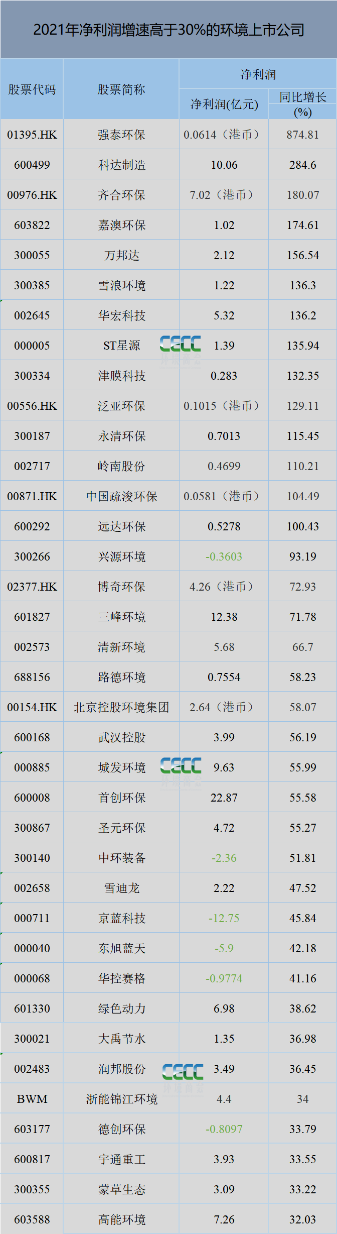 凈利潤增速方面,2021年,凈利潤增長超過30%的企業(yè)有38家,按照增長幅度降序排列如下: