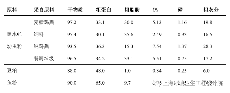 研究表明,黑水虻幼蟲(chóng)的營(yíng)養(yǎng)價(jià)值較高,營(yíng)養(yǎng)組成具有一定的可塑性。分析表1數(shù)據(jù)可知,其體內(nèi)特定營(yíng)養(yǎng)組分的含量高低可通過(guò)調(diào)節(jié)其采食的有機(jī)廢棄物的營(yíng)養(yǎng)來(lái)實(shí)現(xiàn)。黑水虻烘干蟲(chóng)粉中粗脂肪、鈣和灰分的含量受到采食底物的影響較大,而蛋白質(zhì)和氨基酸組成則相對(duì)比較穩(wěn)定。雖然幼蟲(chóng)的氨基酸總含量低于黃粉蟲(chóng)、蠅蛆、桑蠶蛹的氨基酸含量,但氨基酸如賴氨酸、蛋氨酸、亮氨酸、纈氨酸和酪氨酸含量較高,可通過(guò)優(yōu)化飼料配方增加飼料氨基酸含量,并不影響作為動(dòng)物飼料蛋白的品質(zhì)。表1 采食不同底物黑水虻與豆粕和魚(yú)粉的營(yíng)養(yǎng)成分含量(%)比較