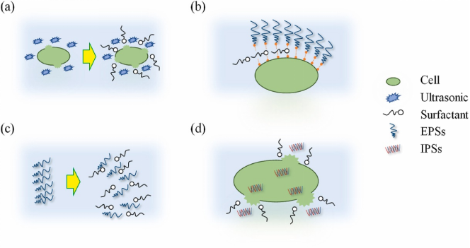 圖3 表面活性劑強化超聲波法提取的四種機理。(a)降低表面張力;(b)破壞EPSs與細胞體間的非共價鍵;(c)相似相溶作用;(d)破壞細胞壁或細胞膜結構(來自原文)