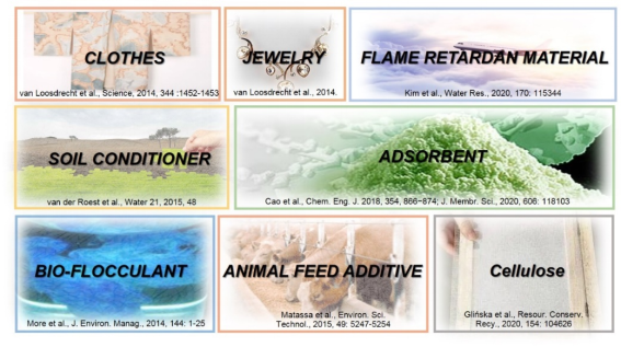 污水資源化是未來污水處理的發(fā)展方向,也是人類可持續(xù)發(fā)展的必然。自污水或污泥中提取的多糖、蛋白質、腐殖質、核酸、DNA、磷脂、糖醛酸和礦物質等,可作為印染原料、首飾和服裝原料、阻燃材料、土壤調節(jié)劑、吸附劑、生物絮凝劑、飼料添加劑,應用于水處理、農業(yè)、園藝、造紙工業(yè)、醫(yī)療、建筑工業(yè)等領域,具有重大的回收價值。