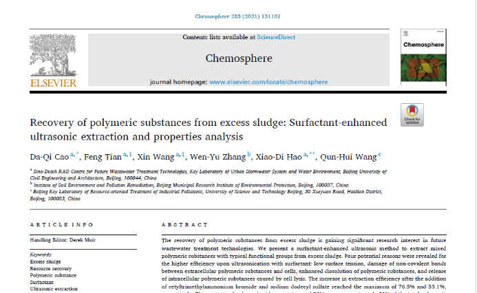 Cao D Q, Tian F, Wang X, Zhang W Y, Hao X D, Wang Q H. Recovery of polymeric substances from excess sludge: Surfactant-enhanced ultrasonic extraction and properties analysis. Chemosphere, 2021, 283: 131181.