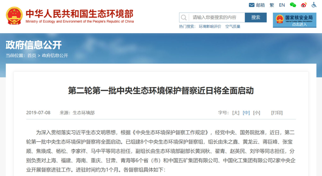 2019年7月,為深入貫徹落實習(xí)近平生態(tài)文明思想,根據(jù)《中央生態(tài)環(huán)境保護督察工作規(guī)定》,經(jīng)黨中央、國務(wù)院批準(zhǔn),第二輪第一批中央生態(tài)環(huán)境保護督察全面啟動。