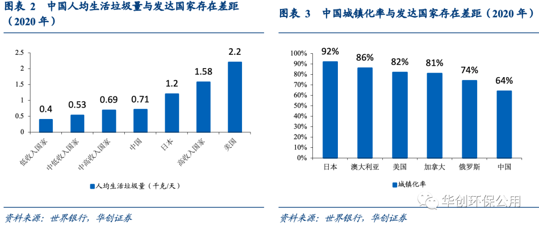 伴隨經(jīng)濟(jì)發(fā)展以及居民生活水平的提升,城鎮(zhèn)人均產(chǎn)生垃圾量也將隨之提升。我們選取第六次(2010)和第七次人口普查(2020)的城鎮(zhèn)人口數(shù)據(jù),計算得出2010年我國城鎮(zhèn)人均垃圾清運量為0.65千克/天,2020年這一數(shù)字已升至0.71千克/天,同期我國的城鎮(zhèn)化率由49.7%提升至63.9%,然而這兩項數(shù)據(jù)與發(fā)達(dá)國家均存在一定差距。根據(jù)世界銀行報告《2050年全球固體廢物管理一覽》的統(tǒng)計,高收入國家的人均生活垃圾量均值為1.58千克/天,美國更是達(dá)到了2.2千克/天,是我國的三倍;我國約64%的城鎮(zhèn)化率與發(fā)達(dá)國家普遍80%以上的城鎮(zhèn)化率相比差距明顯,與部分發(fā)展中國家70%以上的城鎮(zhèn)化率相比,也尚存一定提升空間。