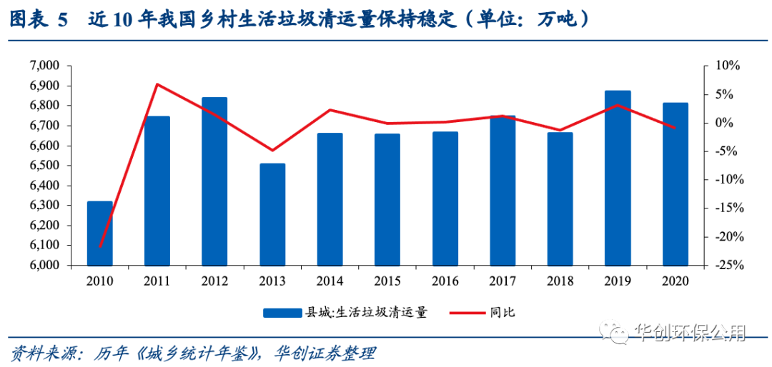 根據(jù)《2020城鄉(xiāng)建設(shè)統(tǒng)計年鑒》,農(nóng)村地區(qū)現(xiàn)每年產(chǎn)生垃圾總量穩(wěn)定在6600萬噸以上,人均垃圾產(chǎn)生量穩(wěn)定處于0.3千克/天的水平。相比城市而言,農(nóng)村的垃圾產(chǎn)生規(guī)模和人均垃圾產(chǎn)生量遠(yuǎn)遠(yuǎn)偏低,雖然存在鄉(xiāng)村人口萎縮的情況,但由于農(nóng)村地區(qū)垃圾收集、處置率存在較大的提高空間,依靠對未處理的垃圾存量的消化和擴(kuò)大處理覆蓋,未來農(nóng)村垃圾處理規(guī)模的擴(kuò)張可期。