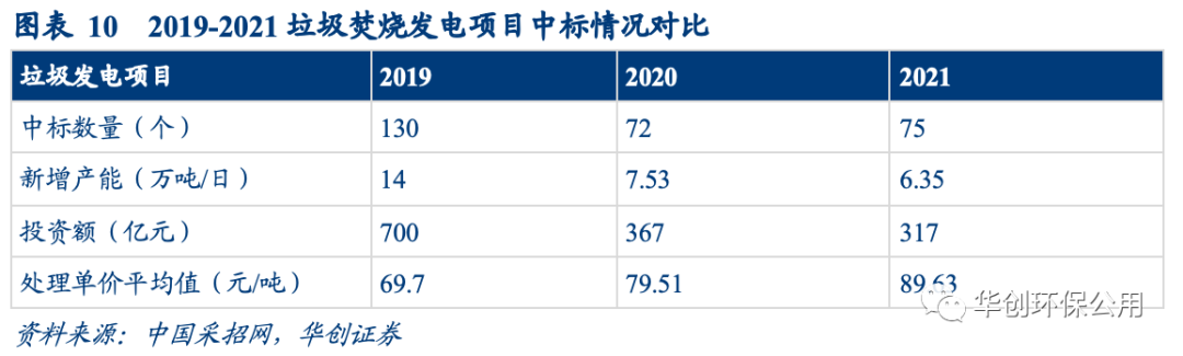垃圾焚燒新訂單釋放速度減緩、處理費價格提升。2021年垃圾焚燒新增體量進(jìn)一步下降,全年中標(biāo)項目總處理規(guī)模達(dá)6.35萬噸/日,同比2020年下降15.67%。與此同時,2021年平均中標(biāo)處理單價為89.63元/噸,同比2020 年增長12.73%。近三年以來中標(biāo)價一直維持快速上升態(tài)勢,疊加政策推動,我們認(rèn)為未來很可能按照“產(chǎn)生者付費”原則,實施居民處理費,健全收費機(jī)制,垃圾處理費單價有望進(jìn)一步提升,降低對補(bǔ)貼依賴程度。