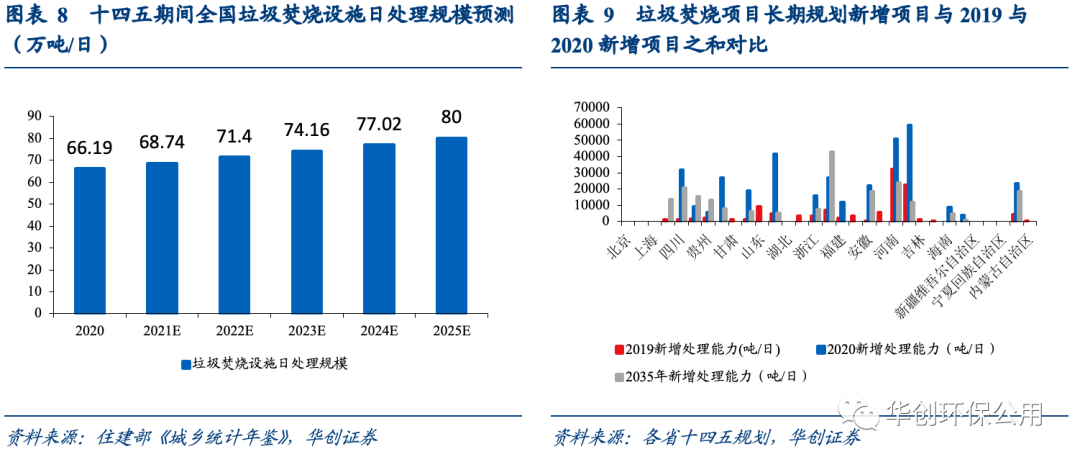 垃圾焚燒設(shè)施日處理規(guī)模超預(yù)期。根據(jù)2020城鄉(xiāng)統(tǒng)計年鑒的數(shù)據(jù),截至2020年底,我國垃圾焚燒設(shè)施的日處理規(guī)模(城鎮(zhèn)+縣城)合計已達(dá)到66.19萬噸/日,超額完成了十三五規(guī)劃58萬噸/日的目標(biāo)。
