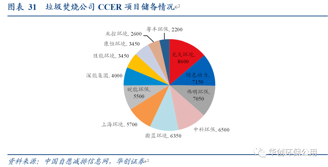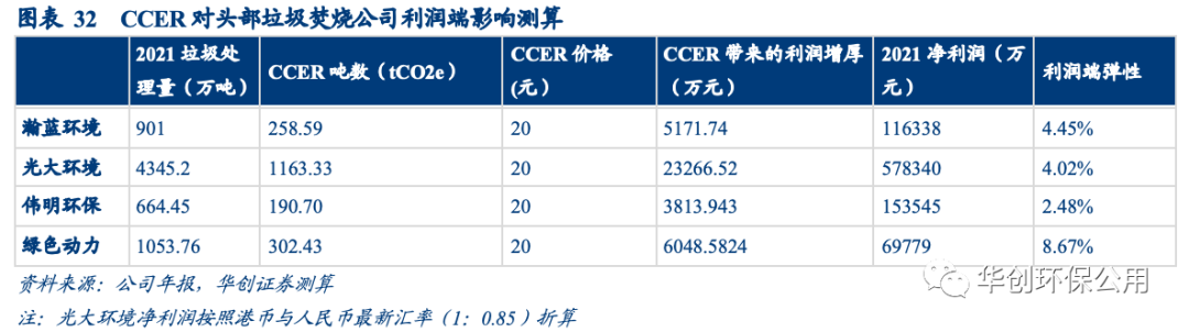 最理想情況下,CCER收入在利潤端可為垃圾焚燒頭部企業(yè)帶來3%-9%的增厚。我們選取瀚藍(lán)環(huán)境、光大環(huán)境、偉明環(huán)保和綠色動力四家頭部垃圾焚燒上市公司進(jìn)行測算,在假設(shè)公司所處理的垃圾全部可以轉(zhuǎn)化為CCER的情況下,按照2021年的垃圾處理量和凈利潤,CCER收入可分別為瀚藍(lán)環(huán)境、光大環(huán)境、偉明環(huán)保、綠色動力帶來4.45%/4.02%/2.48%/8.67的利潤端彈性。